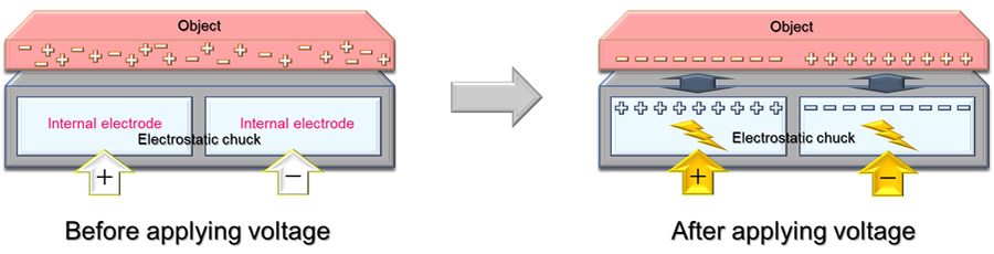 Ang isang electrostatic chuck (ESC) ay isang espesyal na uri ng chuck na gumagamit ng puwersa ng electrostatic upang hawakan, pindutin at kunin ang mga bagay (workpieces). Ang anumang materyal ay nagdadala ng positibo at negatibong singil na hindi nakikita ng hubad na mata. Kapag ang materyal ay nakalagay sa ESC at isang boltahe ng bipolar ay inilalapat sa panloob na mga electrodes ng ESC, ang positibo at negatibong singil ay lilipat sa loob ng materyal upang tumugma sa polaridad ng mga panloob na electrodes ng ESC. Ang pang -akit na ito sa pagitan ng ESC at ang materyal ay tinatawag na Electrostatic Force at ito rin ang pangunahing prinsipyo sa likod ng aming mga chuck.