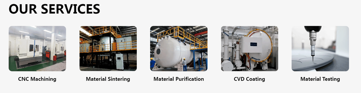Mahigpit naming kinokontrol ang kadalisayan ng silikon na carbide raw na materyales (≥99.999%) at tinanggal ang kontaminasyon ng metal sa panahon ng proseso ng pagsasala upang matugunan ang mahigpit na mga kinakailangan ng mga advanced na proseso ng pagmamanupaktura para sa kontrol ng karumihan ng bakas. Ang siksik na istraktura na nabuo sa pamamagitan ng mataas na temperatura na sintering ay may sobrang mababang porosity, halos ganap na humaharang sa pagtagos ng mga gas gas at by-product. Pinipigilan nito ang pagkasira ng pagganap at paglaki ng butil na dulot ng panloob na pagkasira ng materyal, tinitiyak ang isang purong proseso ng kapaligiran sa silid.
